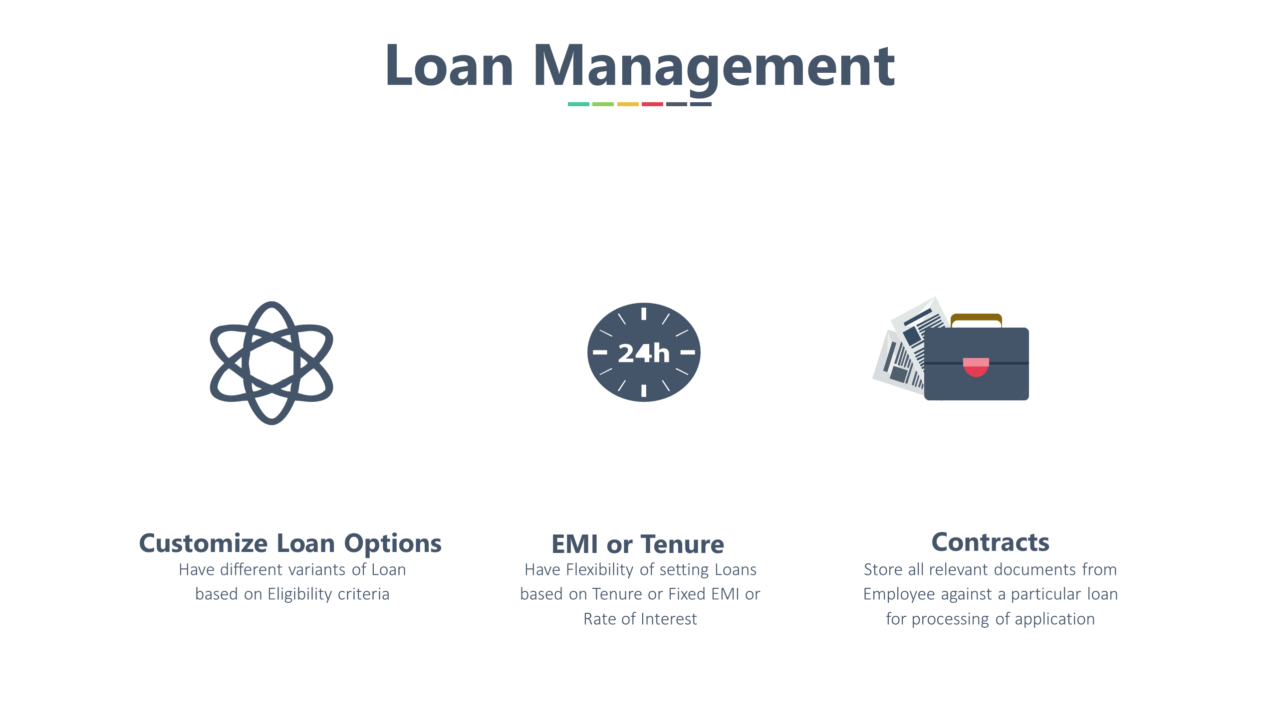 Our Loan Management System simplifies employee loan processing with flexible and secure controls. Customize multiple loan options based on employee eligibility criteria, ensuring fair and policy-driven access. Configure loans with flexible EMI structures, tenure options, fixed installments, or variable interest rates to suit organizational policies. Store and manage all employee loan documents and contracts centrally for quick verification and seamless application processing. Automate loan tracking, approvals, and deductions with payroll integration for accurate repayments. This system improves transparency, reduces manual effort, and ensures compliant loan administration across the organization.