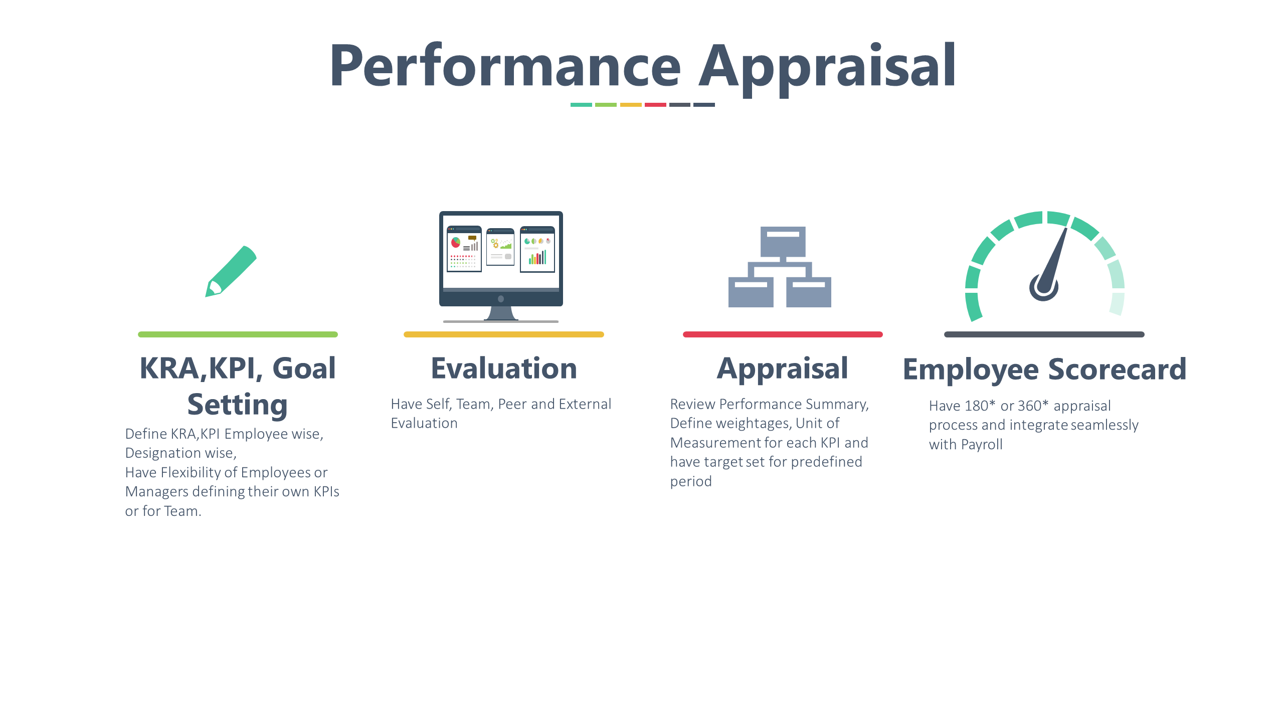 Our Performance Appraisal System helps organizations manage employee performance with clarity and consistency. Define KRAs, KPIs, and goals employee-wise or role-wise with complete flexibility. Enable self, peer, team, and external evaluations for well-rounded performance feedback. Automate appraisal cycles by assigning KPI weightages, measurable units, and time-bound targets. Generate detailed performance summaries for accurate and transparent reviews.